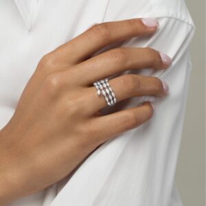 A gorgeous symbol of your love, this sparkling bridal set from features an engagement ring with a romantic heart-shaped diamond haloed by glimmering round diamonds. The band and matching wedding ring are adorned with twists of round diamonds, bringing the total weight of the set to 7/8 carat. The ring is styled in 14K white gold.