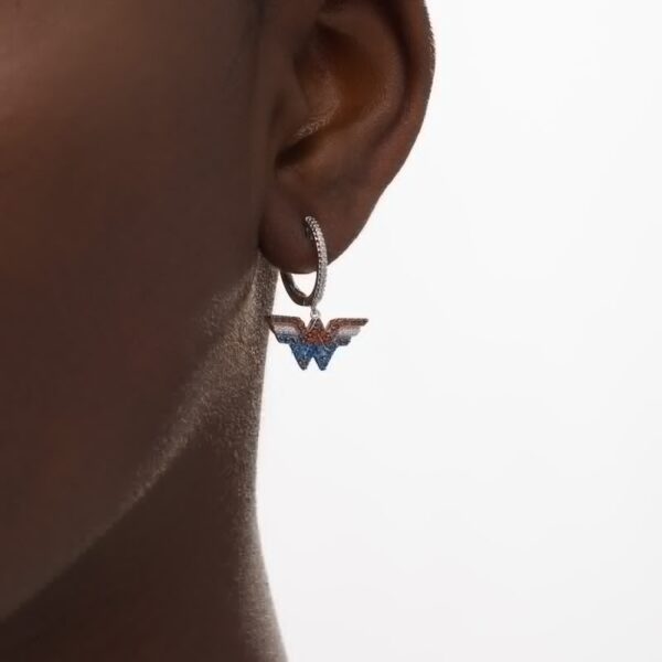 Bursting with action, these gemstone and diamond drop earrings bring eye-catching color to your fearless style. Crafted in sterling silver, each earring showcases the logo lined in regal red garnets, bright blue sapphires and sparkling diamonds. Diamonds adorn the hoop for an extra hint of shimmer. Captivating with 1/20 ct. t.w. of diamonds and a brilliant buffed luster, these earrings secure with hinged backs. This exclusive fine jewelry collection inspires you to wear your strength, confidence and power.