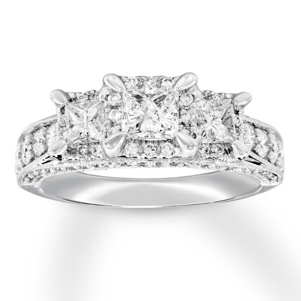 Representing your past, present, and future, three brilliant princess-cut diamonds add modern style to a traditional design in this captivating engagement ring. Round diamonds trace the center and sweep across the band and profiles for sparkle from every angle, bringing the total diamond weight to 1 1/2 carats. Delicate milgrain adds the finishing touch. The ring is crafted of polished 14K white gold.